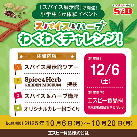 イベント 【12月6日(土)開催】「スパイス展示館」で開催!小学生向け体験型イベント「スパイス&ハーブ わくわくチャレンジ」応募受付中!