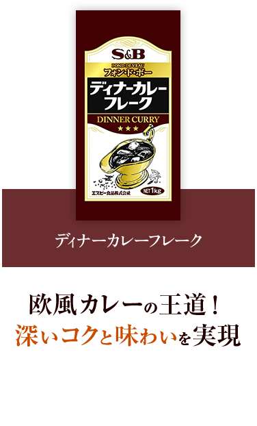仔牛の肉や骨を焼成したものを、ブイヨン、香味野菜、香辛料とともにじっくり煮込んで作るスープで、日本料理で言えば「だし」にあたります。「ディナーカレーフレーク」は、こだわりのフォン・ド・ボーを贅沢に加え、スパイスやハーブ、果実、野菜、小麦粉、調味料などでバランスよく