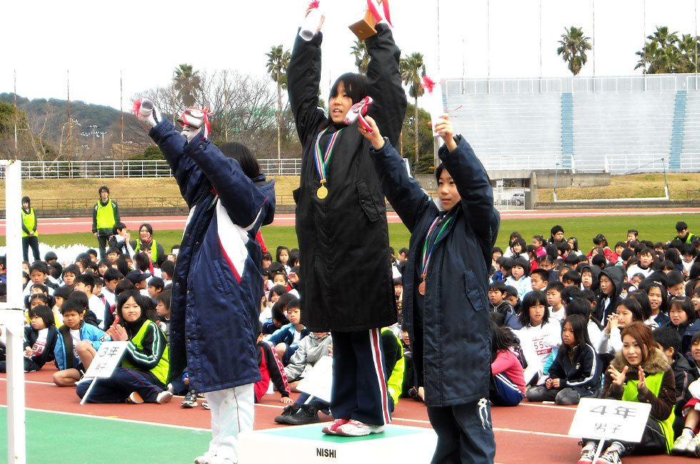 5年男子も上位3名が昨年度ランクトップを上回る激戦となり、得本くんが10分26秒の好タイムで僅差先着。1秒差で谷野くん、さらに2秒差で山内くんが続きました。6年男子も橋詰くんが10分03秒の好タイムで2連覇。2位から4位まで昨年度のベスト10に入るハイレベルでした。