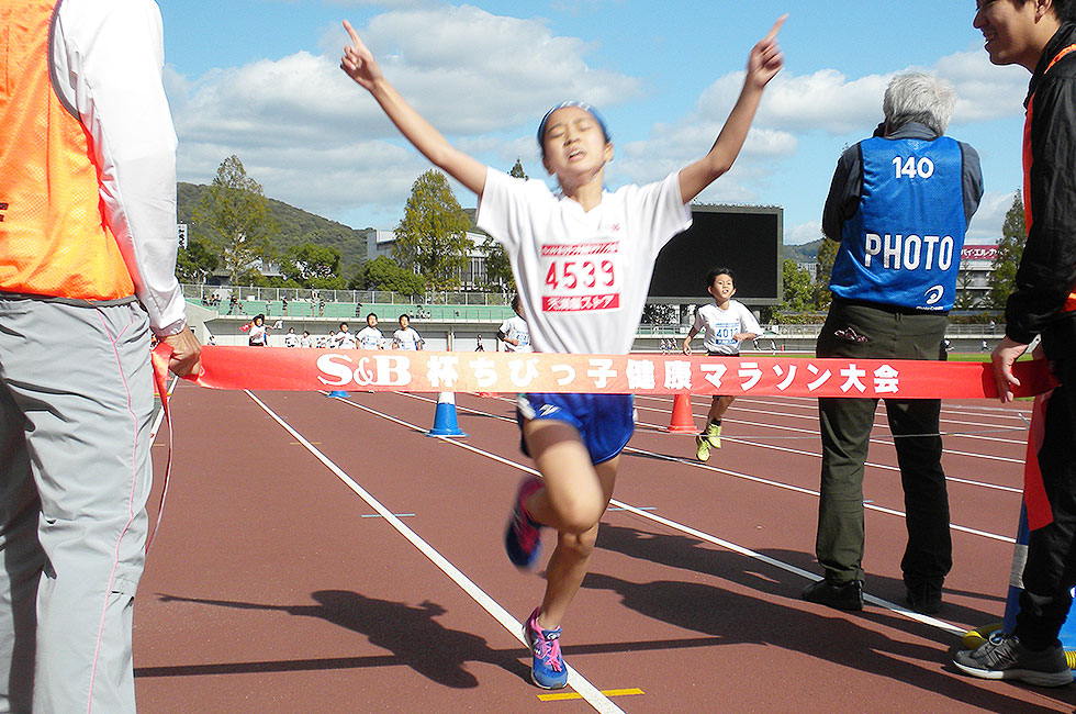 1年男子は馬崎くんが岡山大会歴代3位となる6分4秒の好タイムで優勝。同女子は稲葉さんが岡山大会歴代5位となる6分31秒のタイムで優勝。