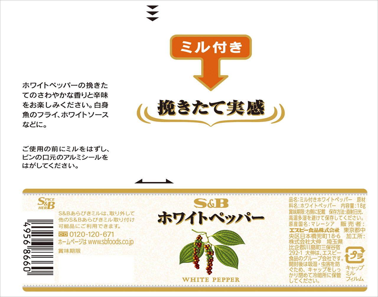 マイルドな香りとピリッとした辛みが特徴で、薄い色の料理の色を損なわず、辛みと風味をつけられます。クリームシチュー、グラタン、卵料理、チキンソテー、白身魚のムニエルなどに最適です。このスパイスにはミルが付いていますのでホワイトペッパーの挽きたてのさわやかで上品な香りが楽しめます。