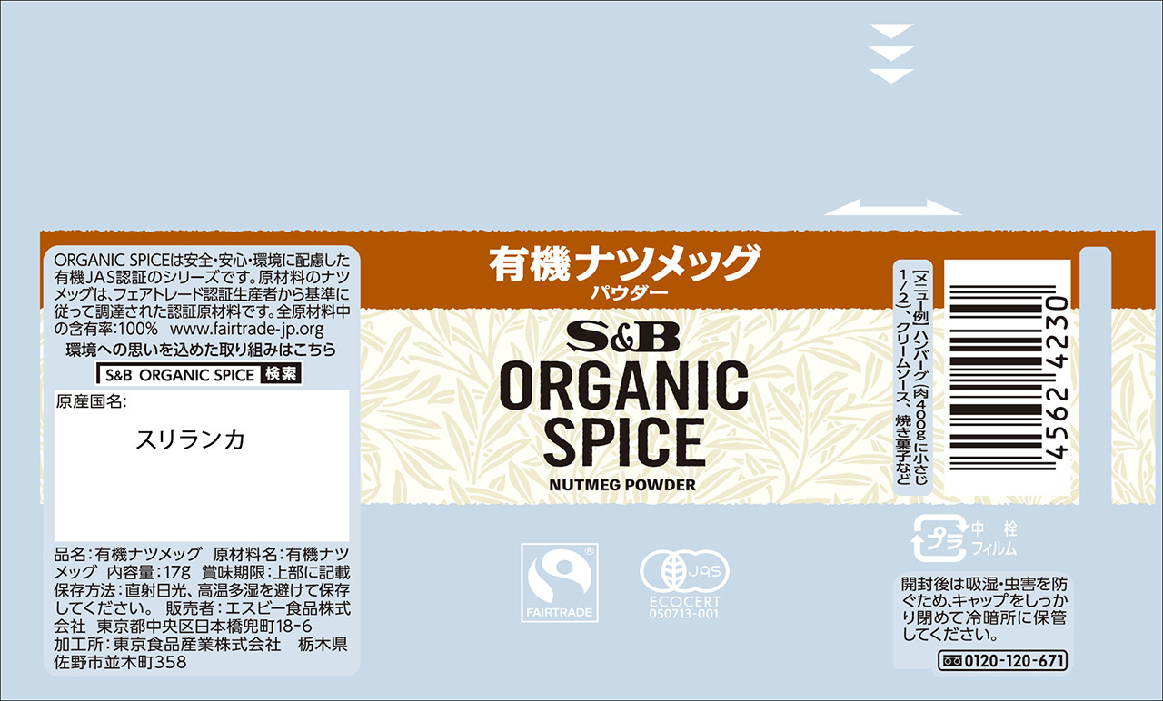 安全・安心・環境に配慮し有機栽培原料を使用した有機JAS認証のスパイス・ハーブシリーズです。基準を守って調達されたフェアトレード認証原材料を使用しています。ハンバーグ、クリームソースなどに。