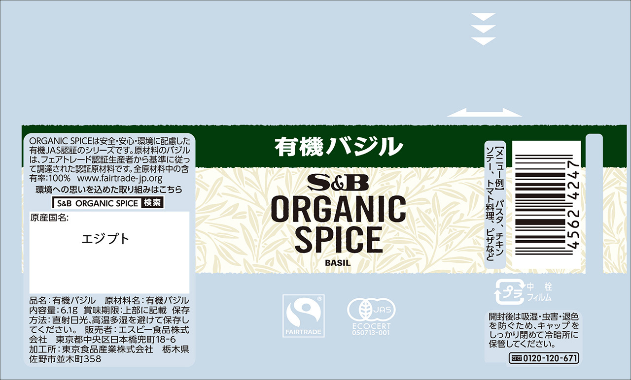 安全・安心・環境に配慮し有機栽培原料を使用した有機JAS認証のスパイス・ハーブシリーズです。基準を守って調達されたフェアトレード認証原材料を使用しています。パスタ、トマト料理などに。