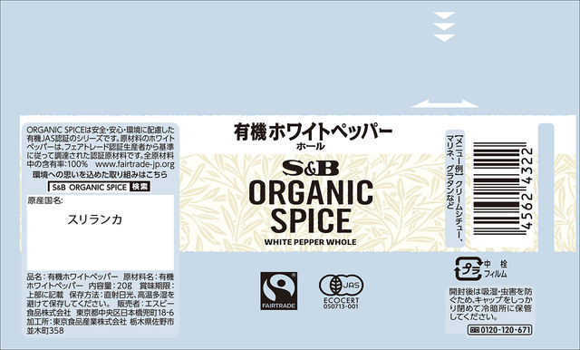 安全・安心・環境に配慮し有機栽培原料を使用した有機JAS認証のスパイス・ハーブシリーズです。基準を守って調達されたフェアトレード認証原材料を使用しています。クリームシチュー、マリネなどに。