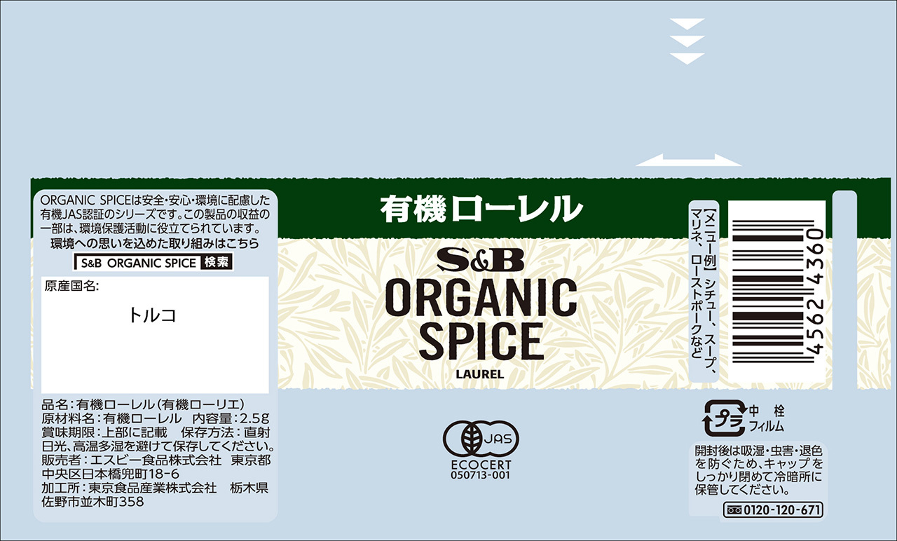 安全・安心・環境に配慮し有機栽培原料を使用した有機JAS認証のスパイス・ハーブシリーズです。煮込み料理に欠かせない、清涼感のある香り。シチュー、スープ、マリネ、ローストポークなどに。