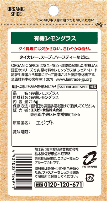 有機JAS認証のスパイス・ハーブシリーズです。基準を守って調達されたフェアトレード認証原材料を使用しています。タイ料理には欠かせない、さわやかな香り。保存に便利なファスナー付き。
