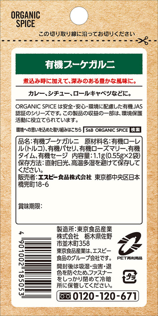 安全・安心・環境に配慮し有機栽培原料を使用した有機JAS認証のスパイス・ハーブシリーズです。煮込み時に加えて、深みのある豊かな風味に。保存に便利なファスナー付き。