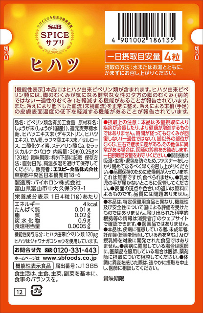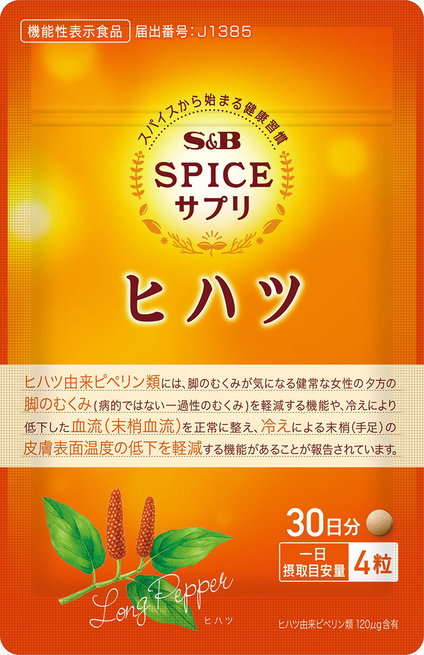 ヒハツの成分「ピペリン類」を配合した機能性表示食品のサプリメント。さらに蒸し生姜粉末とラフマ葉エキスの2種類の植物素材を独自配合。