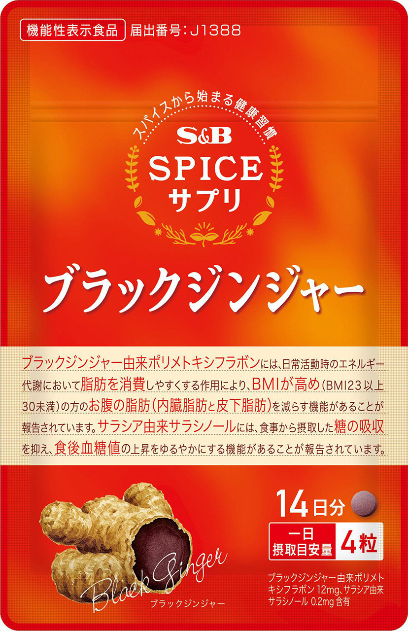 ブラックジンジャーの成分「ポリメトキシフラボン」とサラシアの成分「サラシノール」を配合した機能性表示食品のサプリメント。さらに緑茶エキスを独自配合。