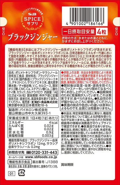 ブラックジンジャーエキス末(国内製造)(ブラックジンジャーエキス、デキストリン)、サラシアエキス末、還元麦芽糖水飴/チャ抽出物、V.C、セルロース、環状オリゴ糖、CMC-Ca、ステアリン酸Ca、二酸化ケイ素、セラック、カルナウバロウ