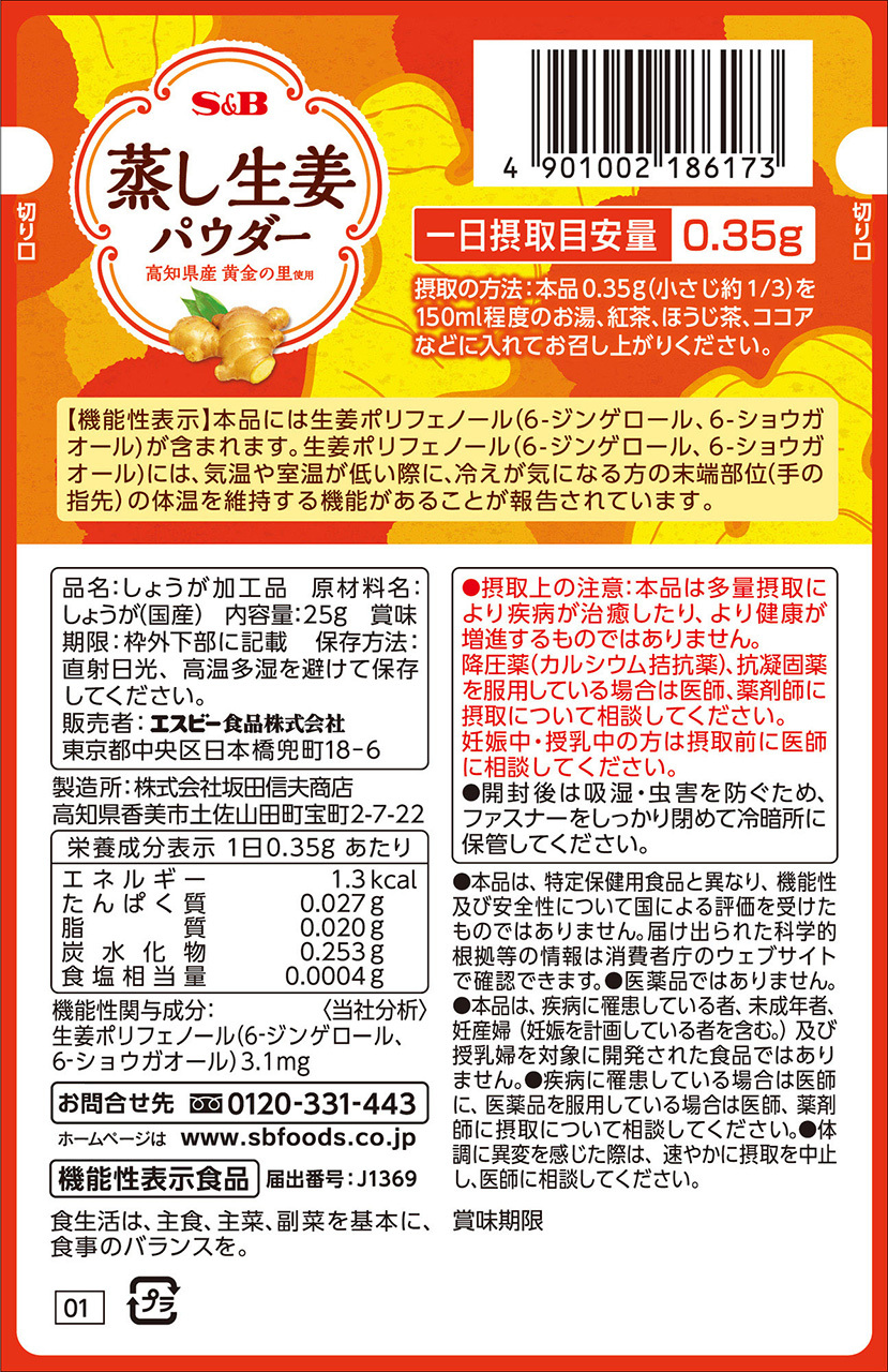 ・機能性表示:本品には生姜ポリフェノール(6-ジンゲロール、 6-ショウガオール )が含まれます。生姜ポリフェノール( 6-ジンゲロール、 6-ショウガオール )には、気温や室温が低い際に、冷えが気になる方の末端部位(手の指先)の体温を維持する機能があることが報告されています。