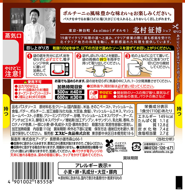 生クリーム(国内製造)、米油、きのこペースト、マッシュルーム、食塩、バター、ポルチーニ、加工油脂(なたね油、大豆油、食塩)、マッシュルームエキス、マッシュルームペースト、小麦粉、クリーミングパウダー、砂糖、マッシュルームエキスパウダー、チーズ、アンチョビエキス、酵母エキスパウダー/増粘剤(加工デンプン、キサンタン)、乳化剤、香料、カロテノイド色素、(一部に小麦・卵・乳成分・大豆・豚肉を含む)