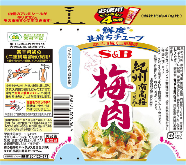 紀州産南高梅の梅干しを100%使用し、種を取り除いた「梅肉」です。料理の味付けなどにたっぷり使える大容量タイプ。空気が中身に触れにくい「鮮度長持ちチューブ(二重構造容器)」を採用。