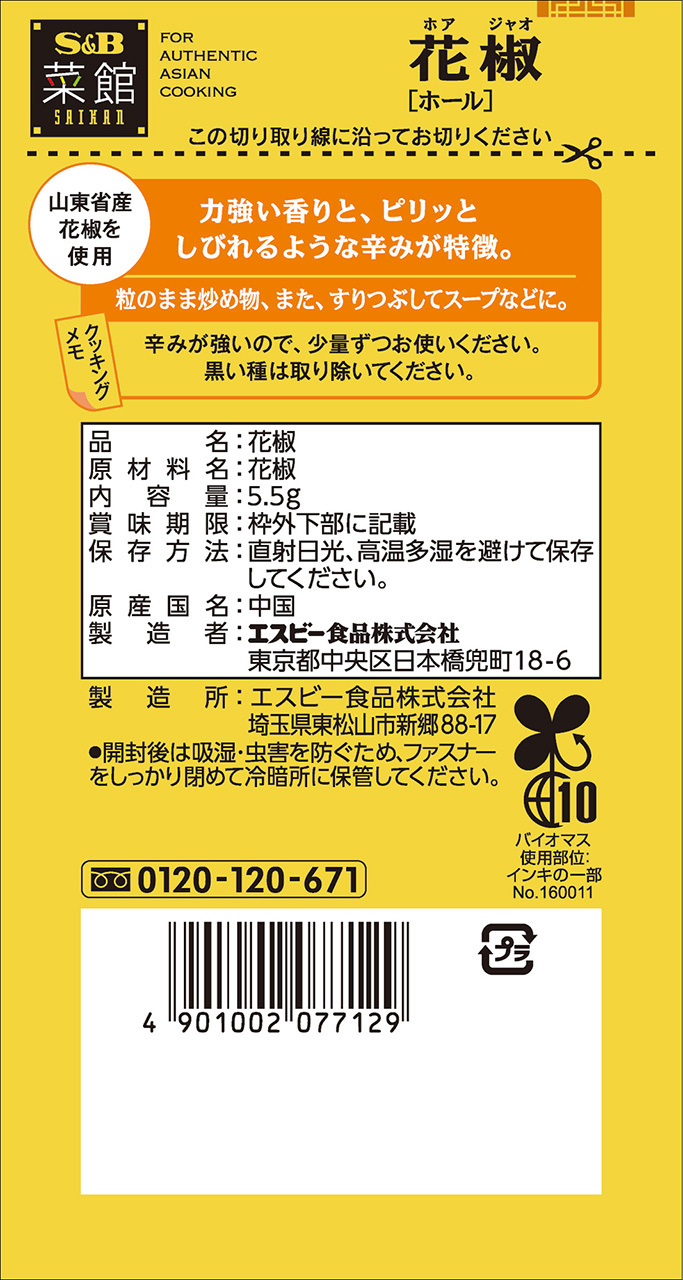 山東省産の厳選した花椒を使用しています。力強い香りと、ピリッとしびれるような辛みが特徴です。粒のまま炒め物などに、また、すりつぶして吸い物や和え物にお使いいただけます。