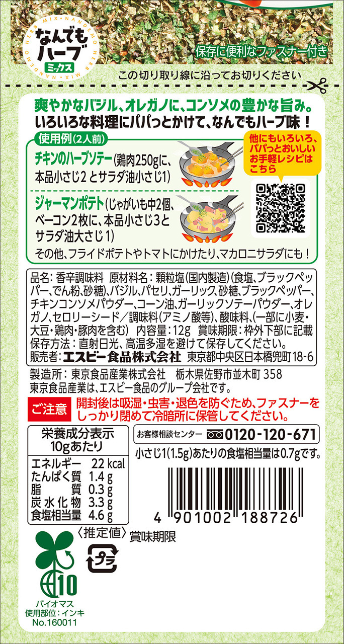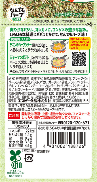 スパイス&ハーブの風味と、旨みのバランスで、料理にサッとかけるだけで味が決まる、汎用シーズニングシリーズ。バジルやオレガノの爽やかな風味と、コンソメの豊かな旨み。