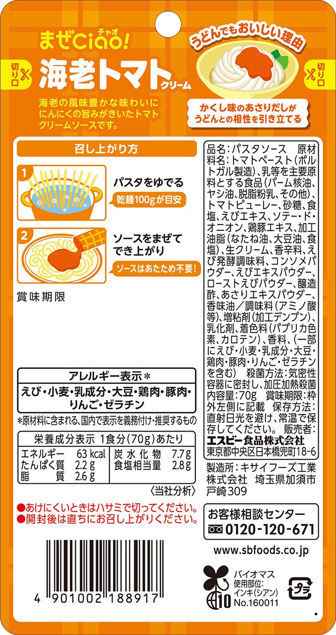 トマトペースト(ポルトガル製造)、乳等を主要原料とする食品(パーム核油、ヤシ油、脱脂粉乳、その他)、トマトピューレー、砂糖、食塩、えびエキス、ソテー・ド・オニオン、鶏豚エキス、加工油脂(なたね油、大豆油、食塩)、生クリーム、香辛料、えび発酵調味料、コンソメパウダー、えびエキスパウダー、ローストえびパウダー、醸造酢、あさりエキスパウダー、香味油/調味料(アミノ酸等)、増粘剤(加工デンプン)、乳化剤、着色料(パプリカ色素、カロテン)、香料、(一部にえび・小麦・乳成分・大豆・鶏肉・豚肉・りんご・ゼラチンを含む)
