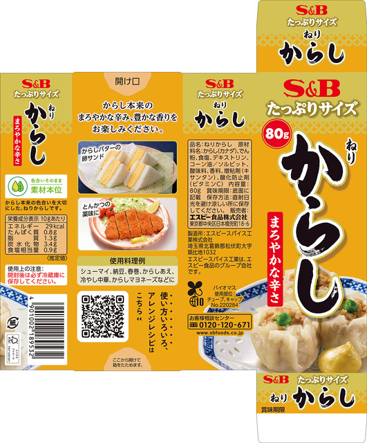 たっぷり使えるチューブタイプのねりからしです。からしの自然な風味、まろやかな辛み、豊かな香りをお楽しみください。