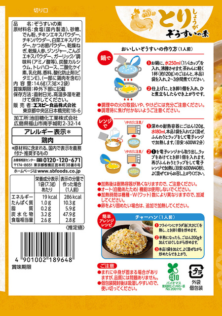 食塩(国内製造)、砂糖、でん粉、チキンエキスパウダー、チキンパウダー、白菜エキスパウダー、かつお節パウダー、乾燥ねぎ、乾燥人参、ジンジャー、こんぶエキスパウダー、ガーリック/調味料(アミノ酸等)、炭酸カルシウム、トレハロース、二酸化ケイ素、乳化剤、香料、酸化防止剤(ビタミンE)、(一部に鶏肉を含む)