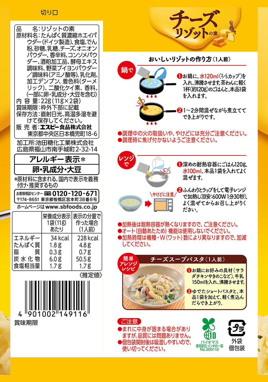 たんぱく質濃縮ホエイパウダー(ドイツ製造)、食塩、でん粉、砂糖、乳糖、チーズ、オニオンパウダー、香辛料、コンソメパウダー、酒粕加工品、酵母エキス調味料、野菜ブイヨンパウダー/調味料(アミノ酸等)、乳化剤、加工デンプン、着色料(ターメリック)、二酸化ケイ素、香料、(一部に卵・乳成分・大豆を含む)