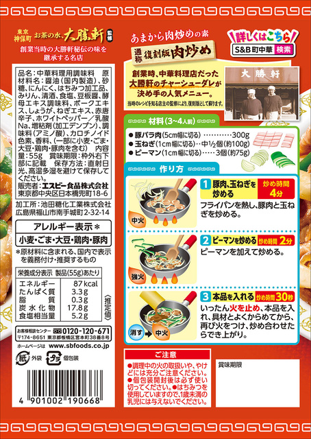 醤油(国内製造)、砂糖、にんにく、はちみつ加工品、みりん、清酒、食塩、豆板醤、酵母エキス調味料、ポークエキス、しょうが、ねぎエキス、赤唐辛子、ホワイトペッパー/乳酸Na、増粘剤(加工デンプン)、調味料(アミノ酸)、カロチノイド色素、香料、(一部に小麦・ごま・大豆・鶏肉・豚肉を含む)