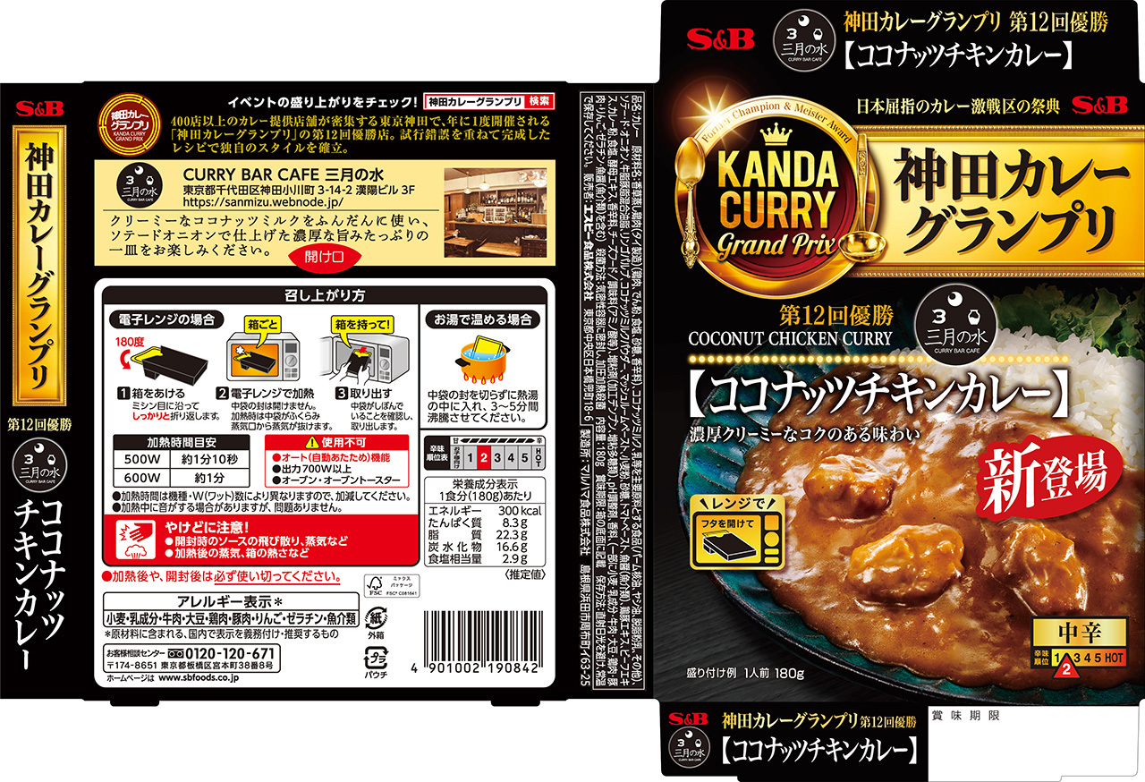 香草蒸し鶏肉(タイ製造)(鶏肉、でん粉、食塩、砂糖、香辛料)、ココナッツミルク、乳等を主要原料とする食品(パーム核油、ヤシ油、脱脂粉乳、その他)、ソテー・ド・オニオン、牛脂豚脂混合油脂、リンゴパルプ、ココナッツミルクパウダー、マッシュルームペースト、小麦粉、砂糖、トマトペースト、魚醤(魚介類)、鶏豚エキス、ビーフエキス、カレー粉、食塩、酵母エキス、香辛料、チーズフード/調味料(アミノ酸等)、増粘剤(加工デンプン、増粘多糖類)、pH調整剤、香料、(一部に小麦・乳成分・牛肉・大豆・鶏肉・豚肉・りんご・ゼラチン・魚醤(魚介類)を含む)