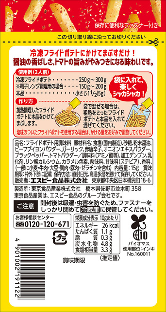 冷凍フライドポテトにかけてまぶすだけ。醤油の香ばしさ、トマトの旨みがやみつきになる味わいです。量の調節がしやすい、ファスナー付き袋タイプ。
