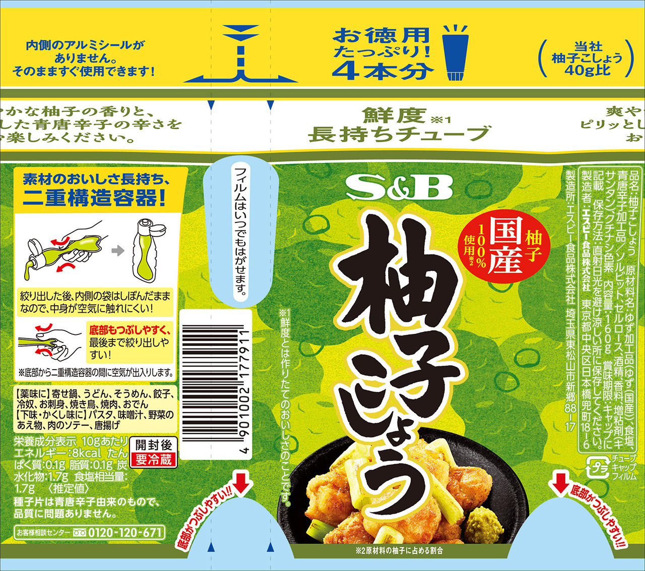 空気が中身に触れにくい「鮮度長持ちチューブ」を採用した、お徳用タイプの柚子こしょうチューブ。国産柚子を100%使用。柚子の爽やかな香りと、青唐辛子のピリッとした辛みをお楽しみください。