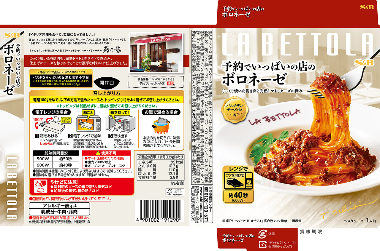 「予約でいっぱいの店」として有名な東京・銀座「ラ・ベットラ」落合務シェフ監修。豚と牛挽肉を完熟トマト、赤ワインでじっくり煮込んだ濃厚な味わい。別添特製チーズトッピング付き。