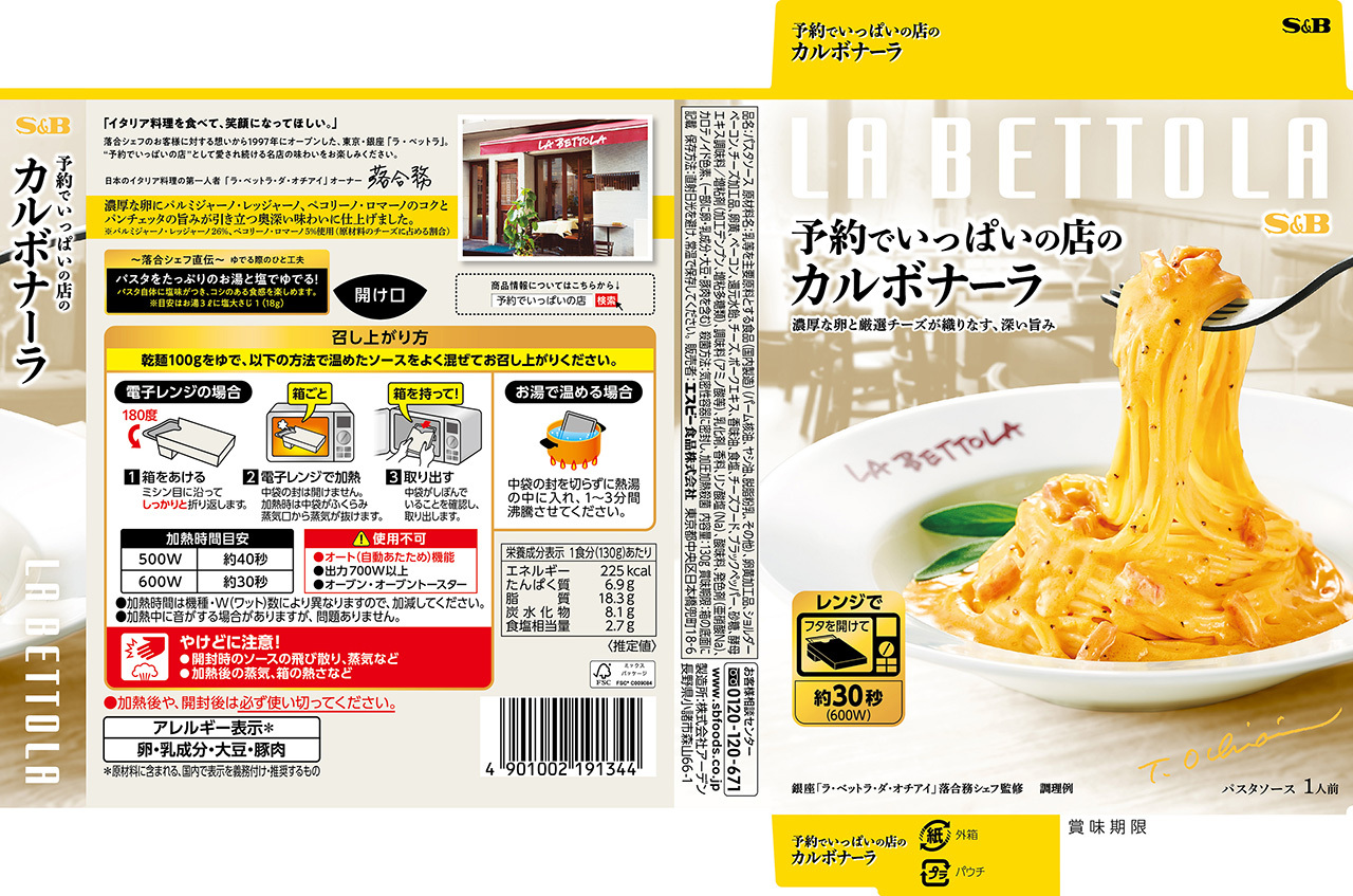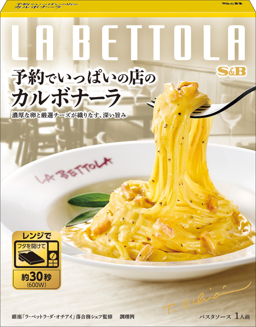 「予約でいっぱいの店」として有名な東京・銀座「ラ・ベットラ」落合務シェフ監修。パルミジャーノ・レッジャーノとペコリーノ・ロマーノを使用し、卵黄、パンチェッタのお肉の旨みをきかせた味わい。