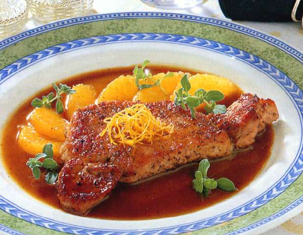 - 【3】【2】の油を捨て、白ワインを加えて底についた焼き目をこそげ取り、オレンジの汁を加えて半量になるまで煮詰め、残りのマジョラム、塩、コショーで調味して火を止め、バターを加えて肉にかけます。オレンジの果肉を添え、【1】の皮を肉にのせます。