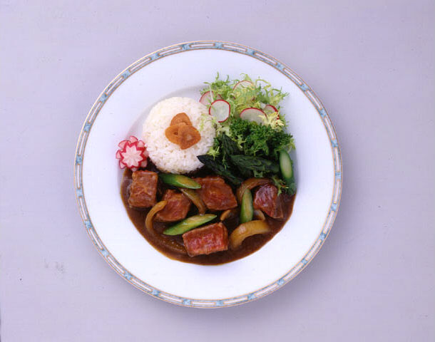 - 【5】サラダ油でスライスにんにくをカリカリに焼き、白飯を炒めます。皿に盛り、ステーキをのせてカレーソースをかけ、野菜サラダをあしらいます。