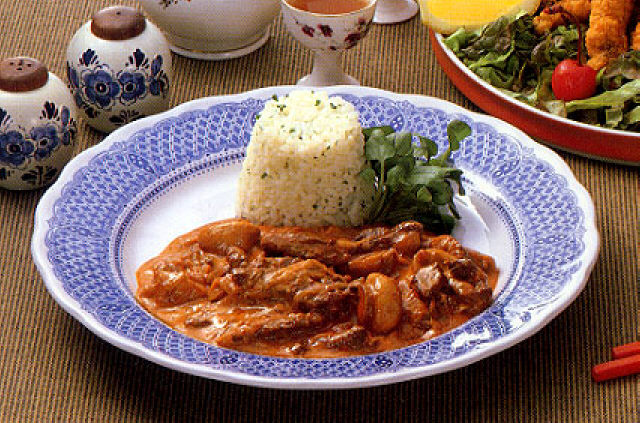 - 【1】牛肉は1cm角の棒状に切り、塩、コショー、パプリカ大さじ2で下味をつけます。エシャロットはみじん切り、玉ねぎは薄切り、トマトは湯むきして皮と種を取り、みじん切りにします。マッシュルームは半分に切ります。
