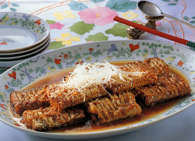 - 【1】たちうおは切り込みを入れて背ビレを引き抜き、身の両面を4-5mm間隔で切り込み、8等分し酒と醤油で下味をつけます。ねぎは半分を小口切りに、半分を白髪ねぎにします。