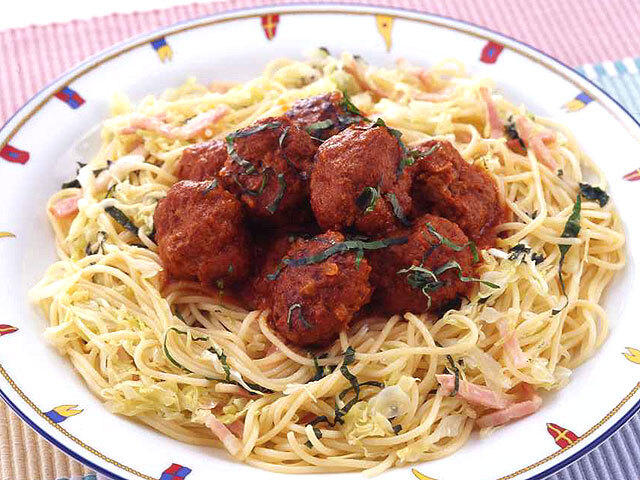 - 【7】【4】が煮上がったところで、生クリームを加え、細切りにしたバジルを加えます。【6】のスパゲッティを皿に盛り、煮上がったミートボール、ソースを上から盛りつけます。