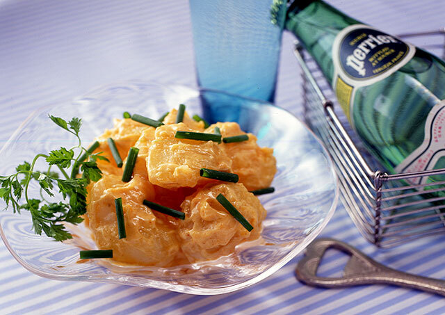 - 【2】ボウルにマヨネーズ、パプリカを合わせて【1】を和え、器に盛りつけて1cm長さに切ったあさつきを散らします。