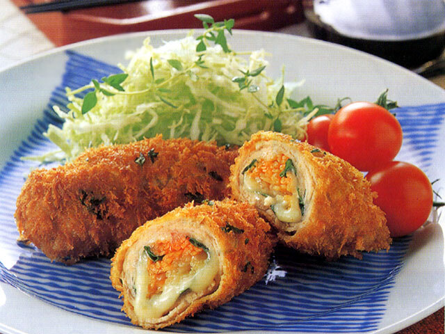 - 【4】【3】に薄力粉、溶き卵、パン粉の順に衣をつけ、180度に熱した油で揚げます。