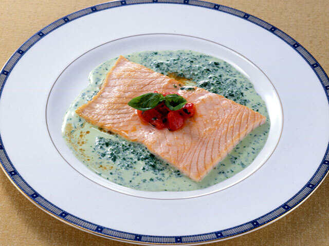 - 【5】【3】のソースを敷き、【2】の鮭を盛りつけ、トマト、バジルを添えます。