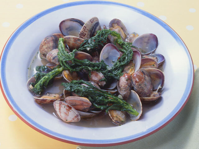 - 【2】鍋に、オリーブオイル、にんにくを熱して香りを出し、あさりを軽く炒め、玉ねぎ、唐辛子、白ワインを加え、蒸し煮にし、貝の口が開いたら、春菊を加え軽く煮て、塩、ホワイトペッパーで味を調え、盛りつけてパセリを散らします。