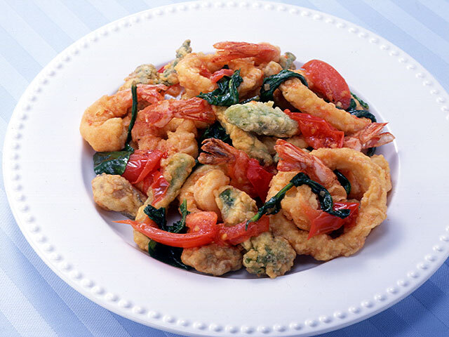 - 【4】フルーツトマトは6つ割りにし、ルッコラは根元を切り落とし、フライパンにオリーブオイルを熱し、フルーツトマト、ルッコラを軽く炒め、揚げた魚介類、菜の花を合わせてレモンの絞り汁をかけます。