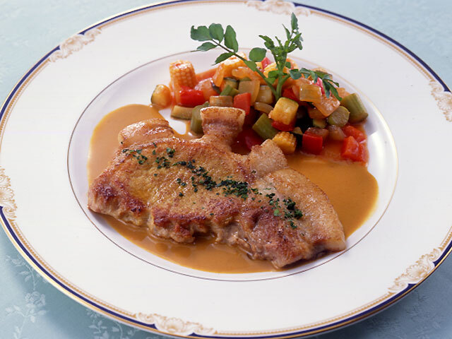 - 【4】器に豚肉を盛りつけ、ソースをかけ、夏野菜の煮込みとクレソンを添えます。