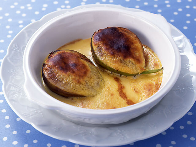 - 【4】耐熱皿に【3】のカスタードクリームを敷き、いちじくをのせて、【2】のザバイヨンをかけ、180度のオーブンで4-5分色づくまで焼きます。