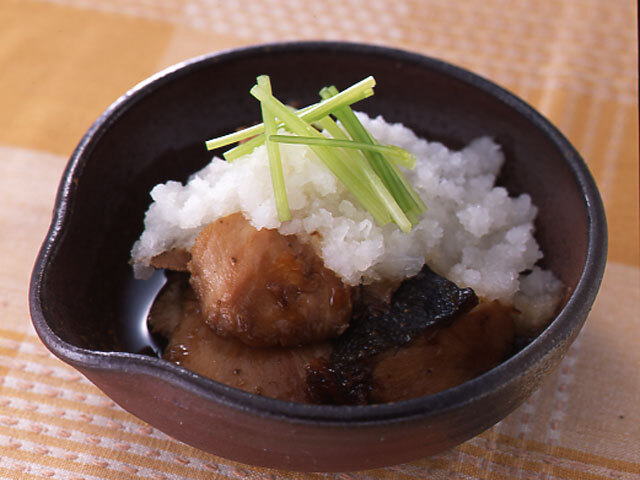 - 【5】大根をすりおろし、軽く水けを絞ります。【4】を盛りつけて、大根おろしをのせ、3cm長さに切った三つ葉を飾ります。