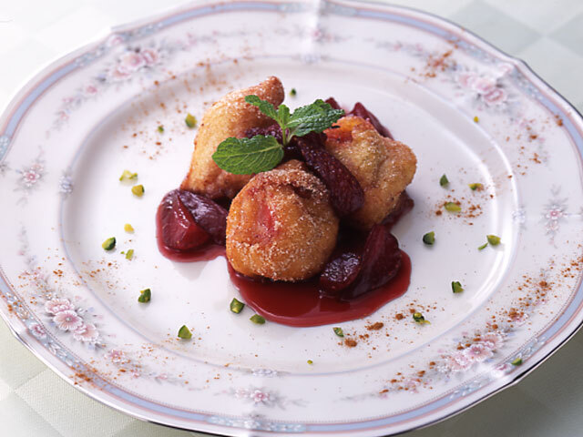 - 【6】160度の油にスプーンで生地をすくって入れ、途中で裏返しながら上げます。油をきって、シナモシナモンシュガーをまぶし、皿に盛りつけて、【1】のソースをかけ、刻んだピスタチオを散らし、ミントを添えます。