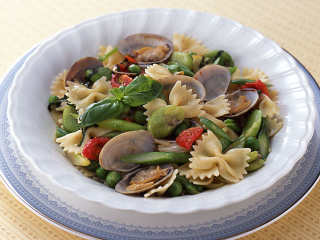 - 【5】【4】にゆで上がったファルファーレを加え、ソースをからめながら少し煮て、塩・コショーで味を調えます。器に盛りつけてバジルを飾ります。