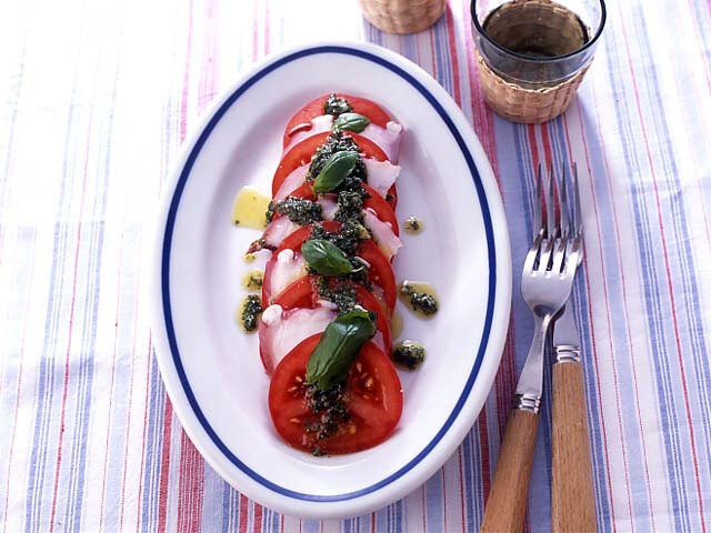 - 【3】器にトマトとたこを盛り合わせ、飾り用のバジルをあしらい、【2】のバジルソースをかけます。