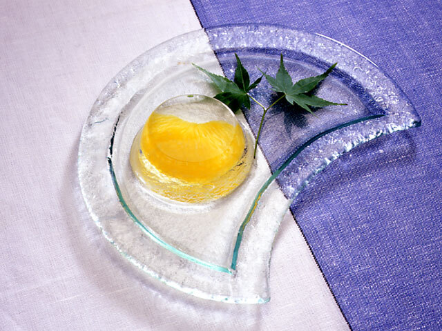 - 【3】一度こして分量の白ワインを加え、鍋底を冷水につけて粗熱をとり、水で濡らしたプリンカップに1cm高さくらい注ぎ入れ、やや固まったときに、夏みかん果肉を1個ずつ置きます。さらに八分目まで錦玉液を注ぎ、冷たく冷やし固めます。