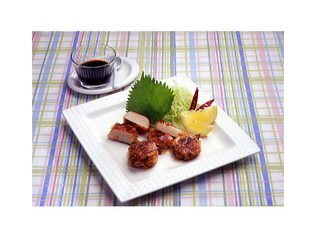 - 【1】帆立貝柱と山いもに一味唐からしを軽くまぶし、花がつおをまぶしつけます。