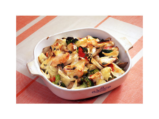 - 【2】耐熱容器に生クリームの分量の半分を流し、鮭、野菜、ひと口大に切ったカマンベールチーズを彩りよく詰め、塩、コショーをし、残りの生クリームをかけ、上にフレッシュオレガノを散らします。