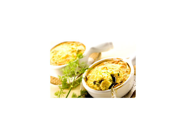 - 【4】キャセロール(耐熱容器)に【2】を盛りつけ、【3】のソースをかけます。