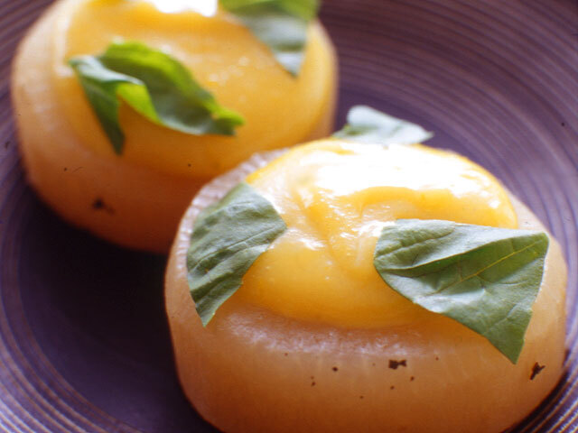 - 【4】【2】に【3】とフレッシュのバジルを添えます。